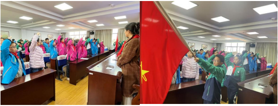 队员们为出席会议的领导们和家长代表系上了鲜艳的红领巾。伴随着激昂雄壮的《出旗曲》,大队旗手迈着铿锵有力的步伐,引领着仪仗队缓缓入场。队员们全体肃立、目光炽热,用庄严的队礼迎接队旗,以蓬勃的朝气唱响《中国少年先锋队队歌》,展现出昂扬的斗志。